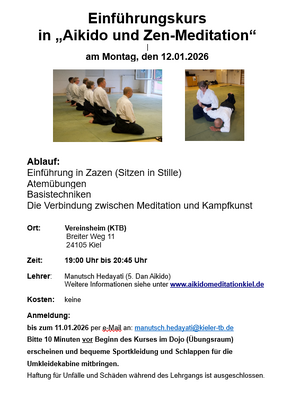 Einführungskurs "Aikido & Zen-Meditation" Montag, 12. Januar 2026 um 19:00 Uhr Breiter Weg 11, 24105 Kiel Jetzt anmelden (bis 11.01.2026)