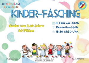 Bunte Kostüme, Musik und jede Menge Bewegung: Beim Kinderfasching feiern Kinder von 4 bis 10 Jahren gemeinsam einen fröhlichen Nachmittag in der Reventlou-Halle. Los geht’s am 11. Februar 2026 von 16:30 bis 18:30 Uhr.